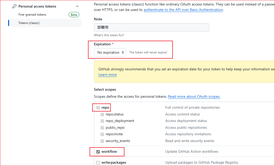token选择永不过期,并勾选 repo 和 workflow 选项。