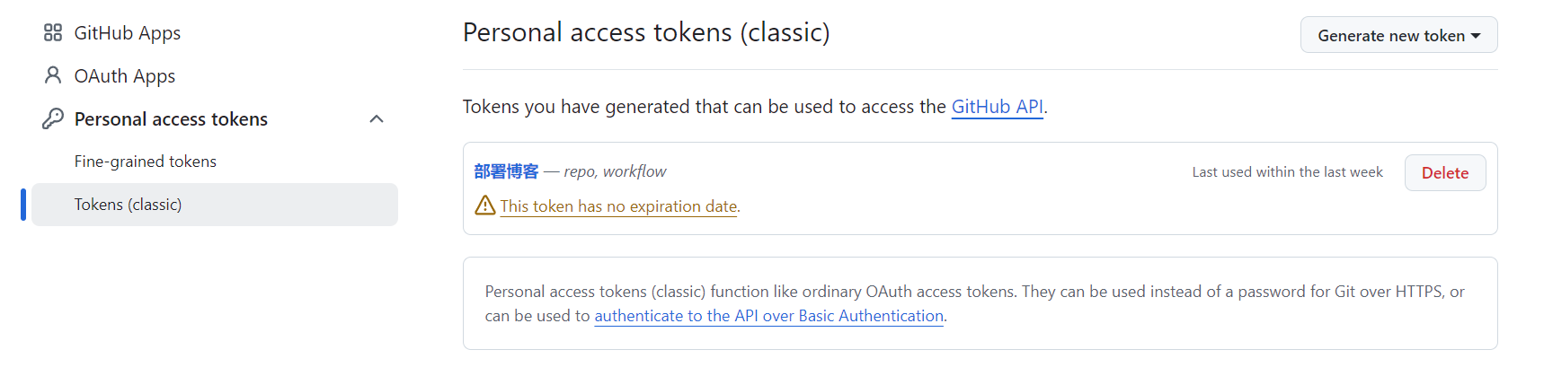 在Github个人的Settings -> Developer Settings -> Personal access tokens中点击Generate new token创建一个新的token(classic),注意保存好该token,后续会使用到。