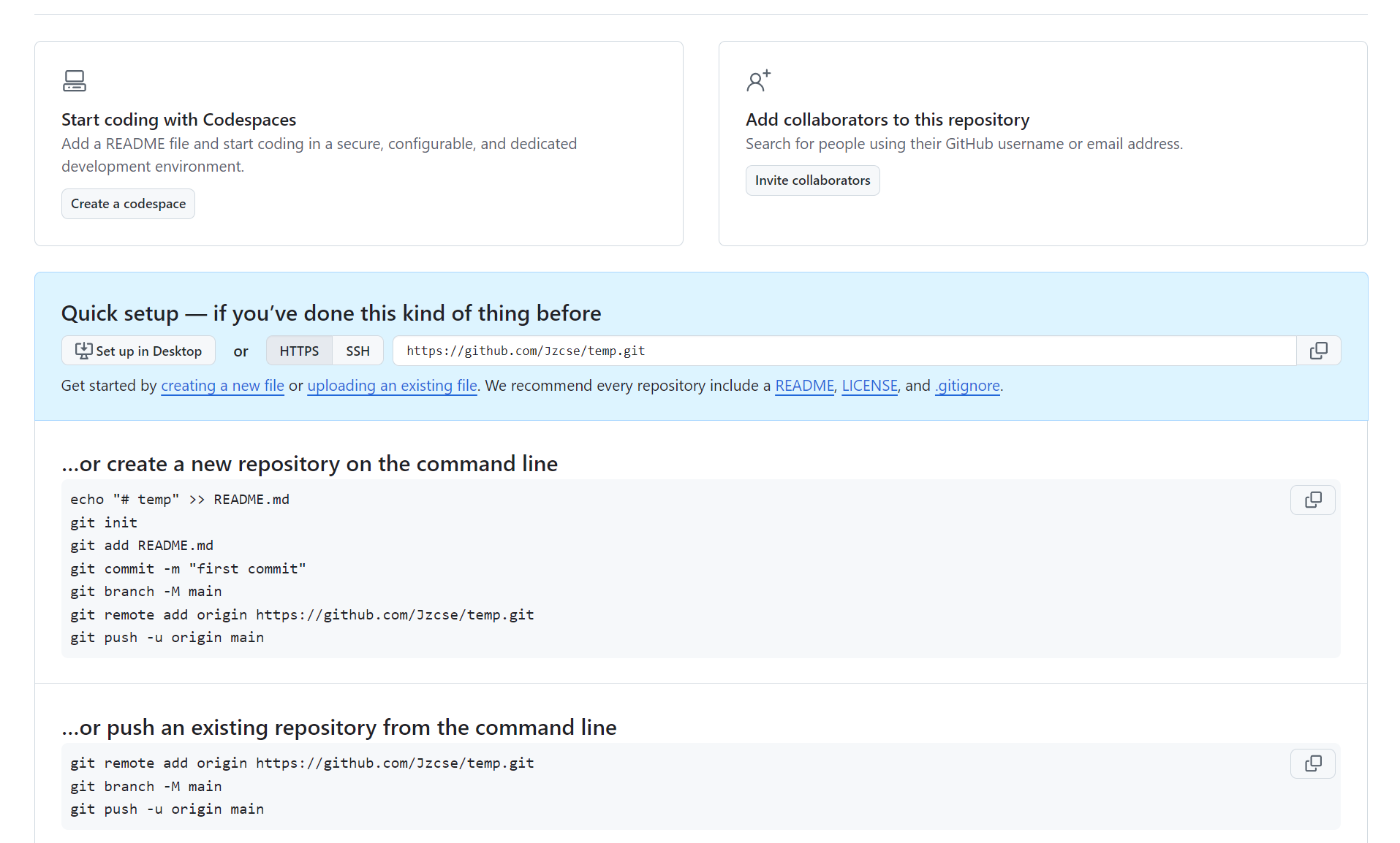 如果你使用git命令工具的话,也可以使用以下命令或者页面提示的命令上传文件: