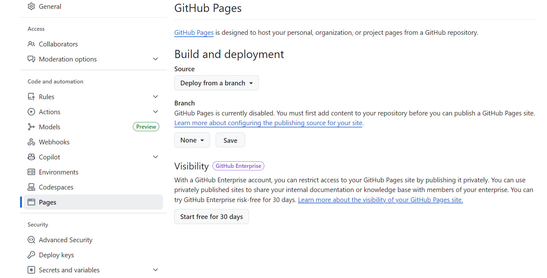 在仓库页面,点击Settings,选择Pages,Branch将None选为main分支,点击Save。