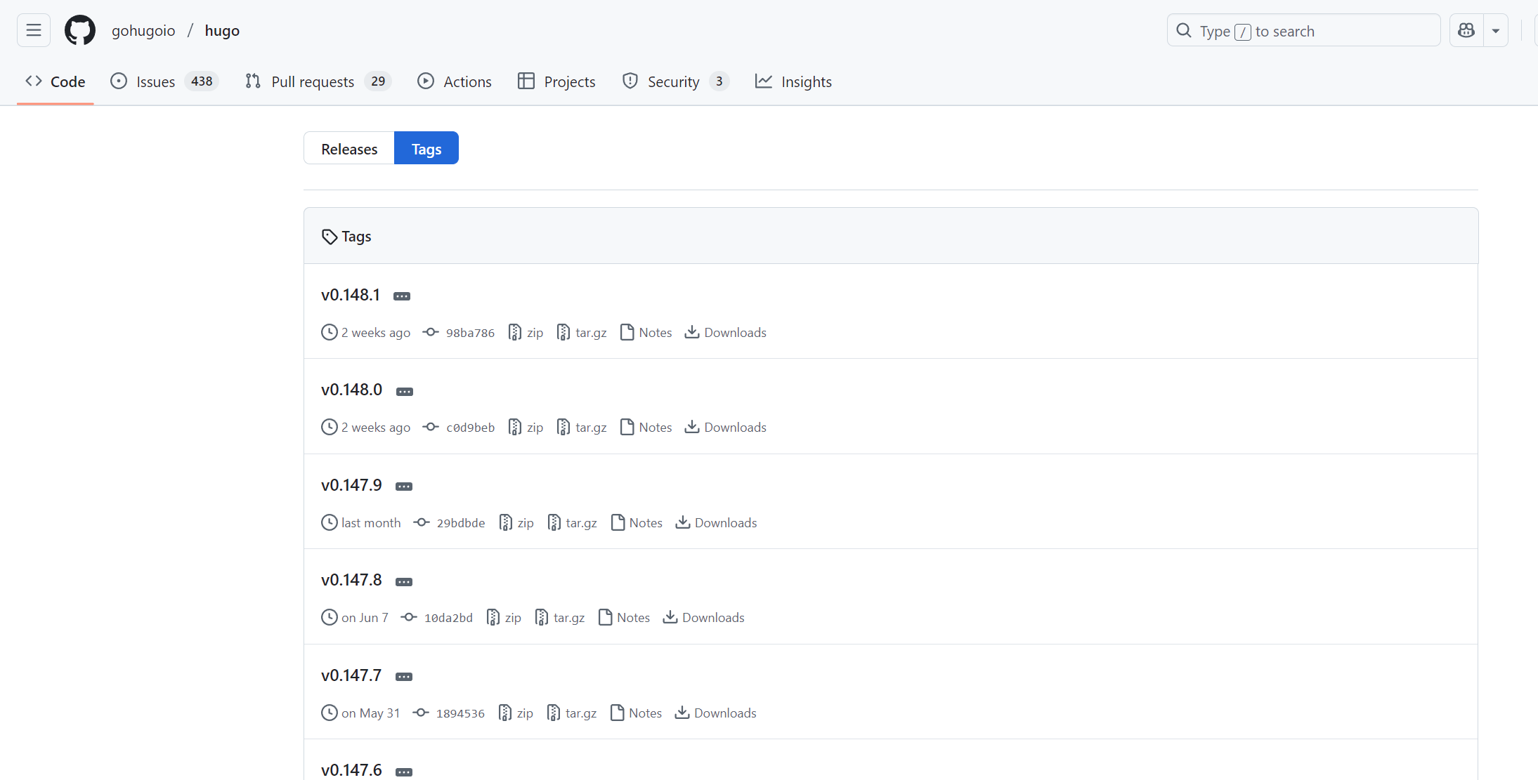 点击Tags选择合适版本后下载对应系统的压缩包,本教程以编写时最新版本0.148.1为例,下载的包名为hugo_extended_0.148.1_windows-amd64.zip