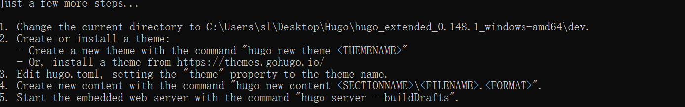 这会在目录下创建一个文件夹,里面存放了你的博客网站的一些配置与文件,另外,在命令提示符中还出现了让我们感兴趣的步骤,通过这些步骤,我们就可以完成自己的博客页搭建了!